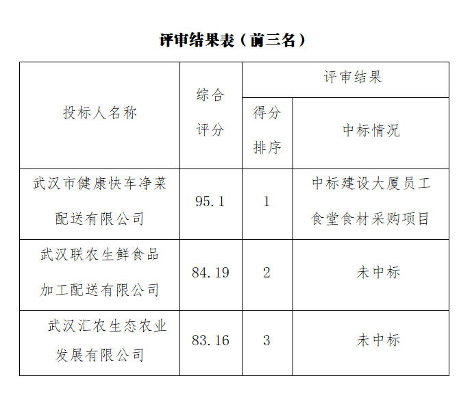 ? ? 經(jīng)評(píng)審,綜合評(píng)分排名第一為武漢市健康快車凈菜配送有限公司,綜合評(píng)分為95.1分,中標(biāo)武漢市政工程設(shè)計(jì)研究院有限責(zé)任公司建設(shè)大廈員工食堂食材采購(gòu)項(xiàng)目。