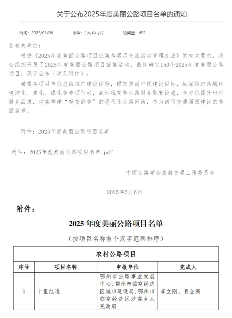 ? ? 近日,中國(guó)公路學(xué)會(huì)正式公布“2025年度美麗公路項(xiàng)目”名單,武漢市政院設(shè)計(jì)的鄂州市臨空經(jīng)濟(jì)區(qū)沙窩鄉(xiāng)“十里紅道”憑借紅色文化傳承與生態(tài)環(huán)境融合的卓越理念,成功躋身全國(guó)150個(gè)標(biāo)桿項(xiàng)目之列。