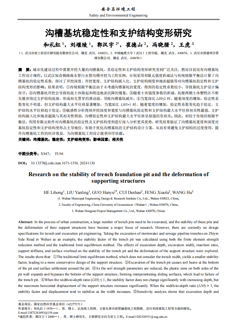 《市政管涵基坑穩(wěn)定性和支護結(jié)構(gòu)變形研究》被中文核心期刊《安全與環(huán)境工程》正式錄用。論文圍繞市政管涵基坑工程的核心安全問題,通過大量工程實踐與理論分析,為基坑穩(wěn)定性評價與變形控制提供了堅實的理論支撐與計算方法。