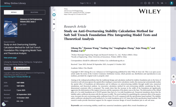 《Study on Anti-Overturning Stability Calculation Method for Soft Soil Trench Foundation Pits: Integrating Model Tests and Theoretical Analysis》成功被 Wiley Online Library 旗下國際權(quán)威期刊 Advances in Civil Engineering 收錄。論文針對軟土地區(qū)市政管涵基坑抗傾覆穩(wěn)定性難題,創(chuàng)新性地融合了室內(nèi)模型試驗分析與典型工程實踐經(jīng)驗,提出了更精準的計算方法,研究成果已被 SCI 檢索,標志著公司在巖土領(lǐng)域的技術(shù)研究水平達到國際前沿。