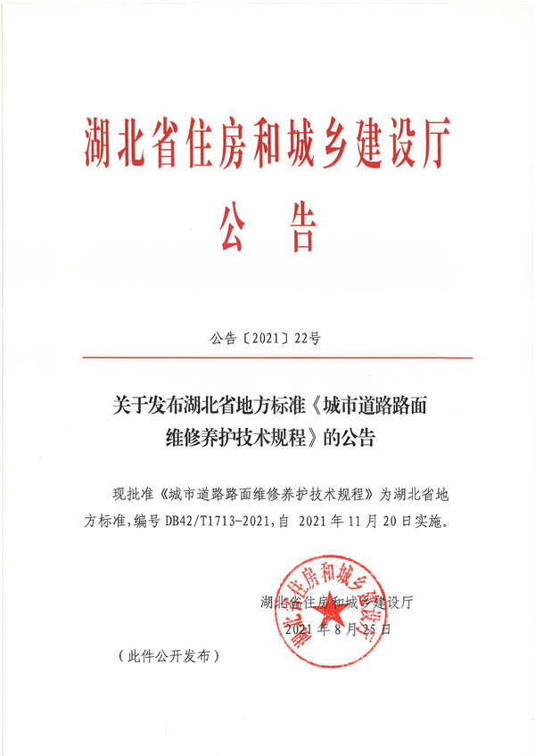 由我公司牽頭起草的湖北省地方標(biāo)準(zhǔn)《城市道路路面維修養(yǎng)護(hù)技術(shù)規(guī)程》(編號(hào):DB42/T 1713-2021)于2021年7月20日由湖北省住房和城鄉(xiāng)建設(shè)廳、湖北省市場(chǎng)監(jiān)督管理局聯(lián)合發(fā)布,并于2021年11月20日起實(shí)施。