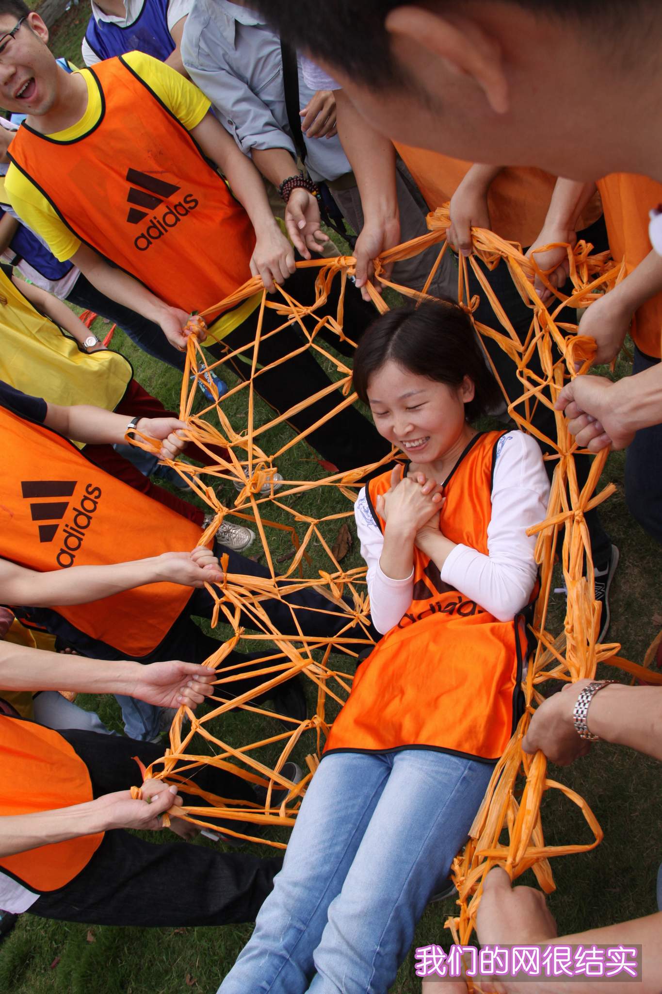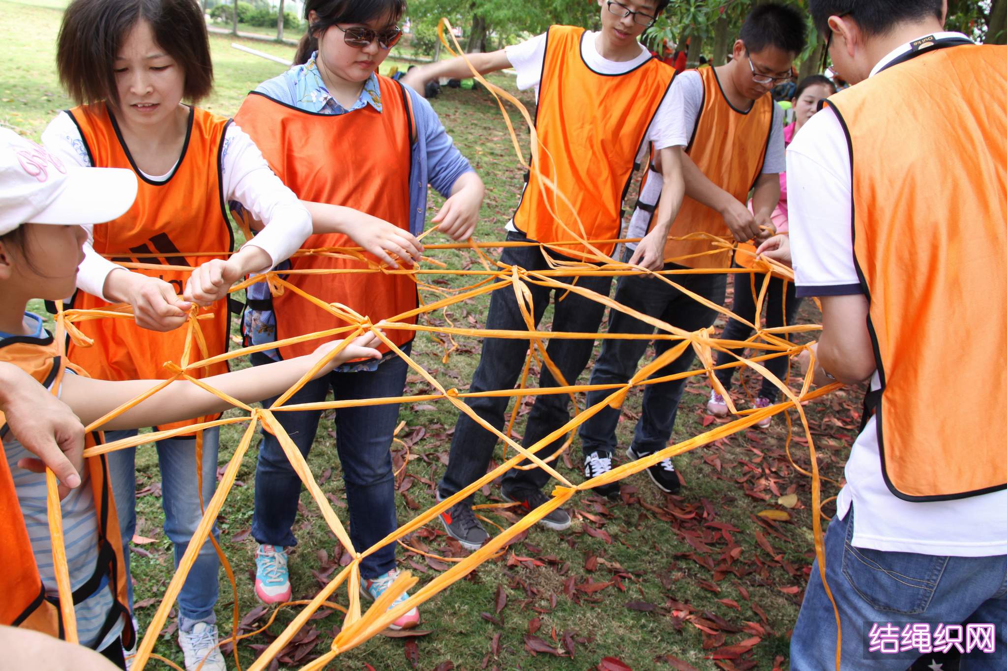 ??? 在第二個項(xiàng)目中,隊(duì)員們要用一捆塑料繩編織成網(wǎng),并要能承受一個人的重量。隊(duì)員們紛紛開動腦筋,一齊動手,很快便完成了任務(wù)。各支隊(duì)伍采用的編制方法不同,形狀也不同,但都能承受起一個人的重量,可以說不分伯仲。